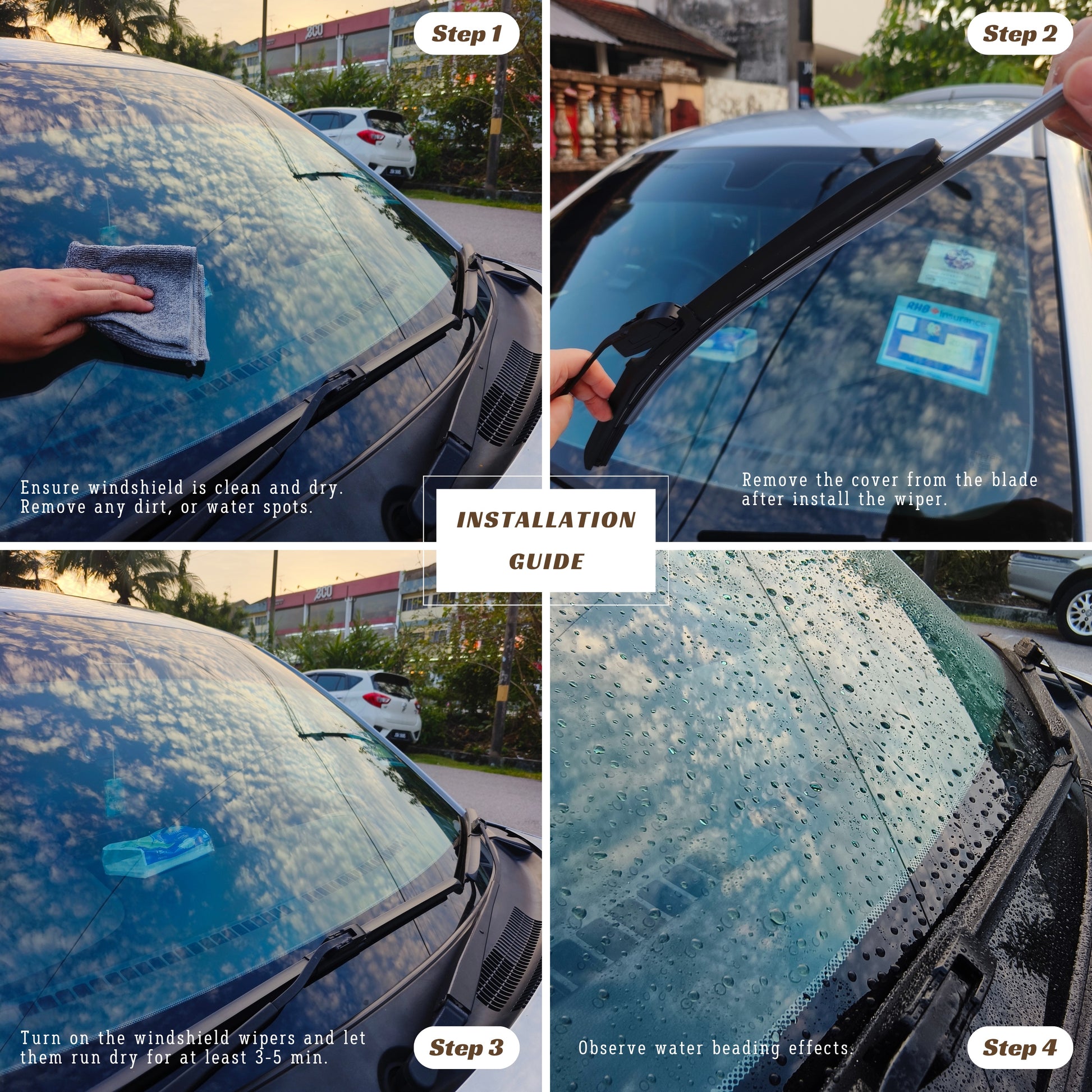 Step 1 : Ensure windshield is clean and dry. Remove any dirt, or water spots to ensure proper application.